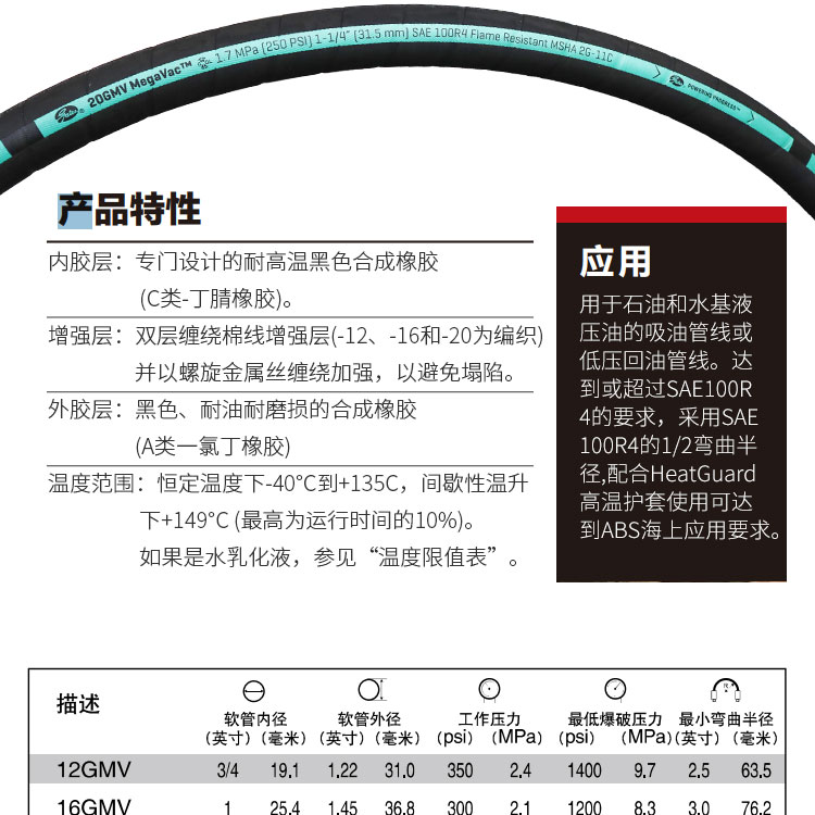 替代PARKER 811(一半弯曲半径) 881(耐高温直到121℃),同时拥有耐高温135℃,一半弯曲半径的特性。